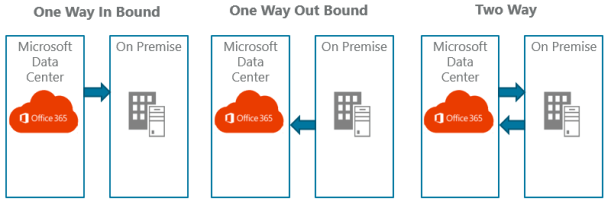 - One Way Out-Bound: Auf SharePoint Server 2013 On Premise kann Inhalt von Office 365 durchsucht werden.